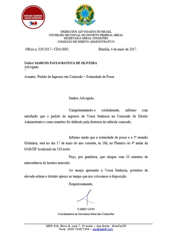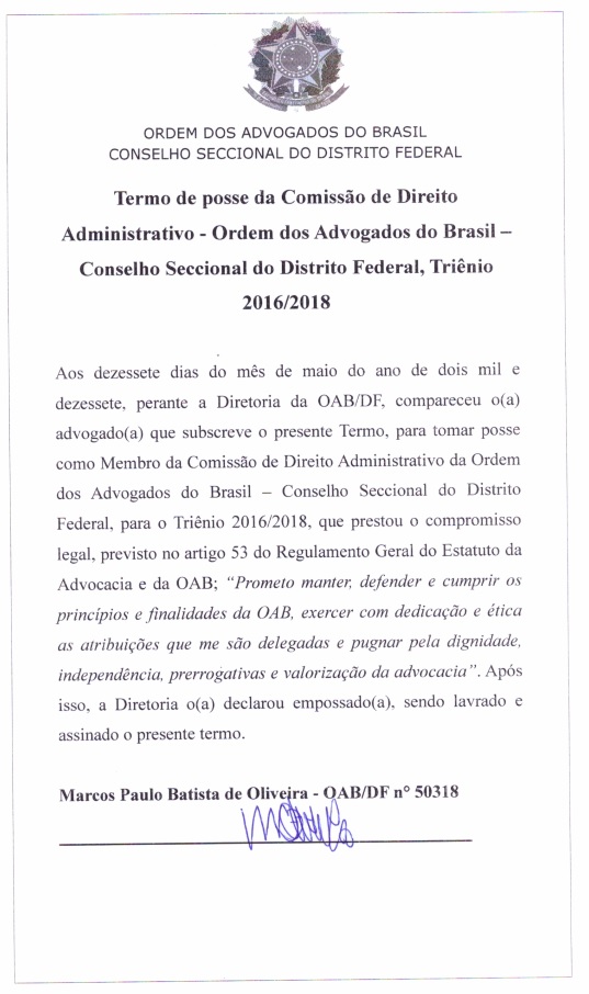 Com muita honra assumi hoje (17/05/17), no auditório da OAB/DF, o cargo de membro efetivo de mais uma Comissão da OAB/DF, a de Direito Administrativo. Ato contínuo da posse já tivemos a primeira reunião ordinária, que contou com uma breve apresentação dos membros, as diretrizes de trabalho e ainda uma palestra sobre Parceria Público-Privadas, proferida pelo Dr. Marcos. Nesta oportunidade os membros da Comissão, de forma unânime, aprovou requerimento para encaminhamento de sugestão ao Exmo. Sr. Governador do Distrito Federal para que o Teatro Nacional de Brasília seja incluído no programa de privatização.