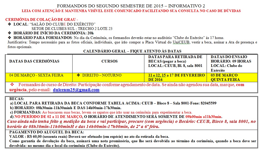 AS PENDÊNCIAS ACADÊMICAS DEVERÃO SER RESOLVIDAS, NA SECRETARIA GERAL DO UNICEUB, COM ANTECEDÊNCIA DE SETE DIAS DA DATA MARCADA PARA A CERIMÔNIA.
