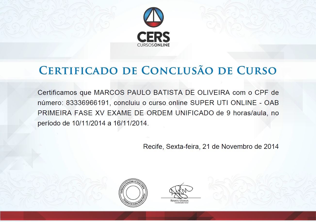 Este curso me ajudou muito na aprovação na 1ª fase do XV Exame de Ordem da OAB… Igualmente estou inscrito no curso de Direito Constitucional do CERS, para a 2ª fase, com a professora Flávia Bahia… Excelente!!! Espero obter o mesmo sucesso alcançado na primeira fase!!!