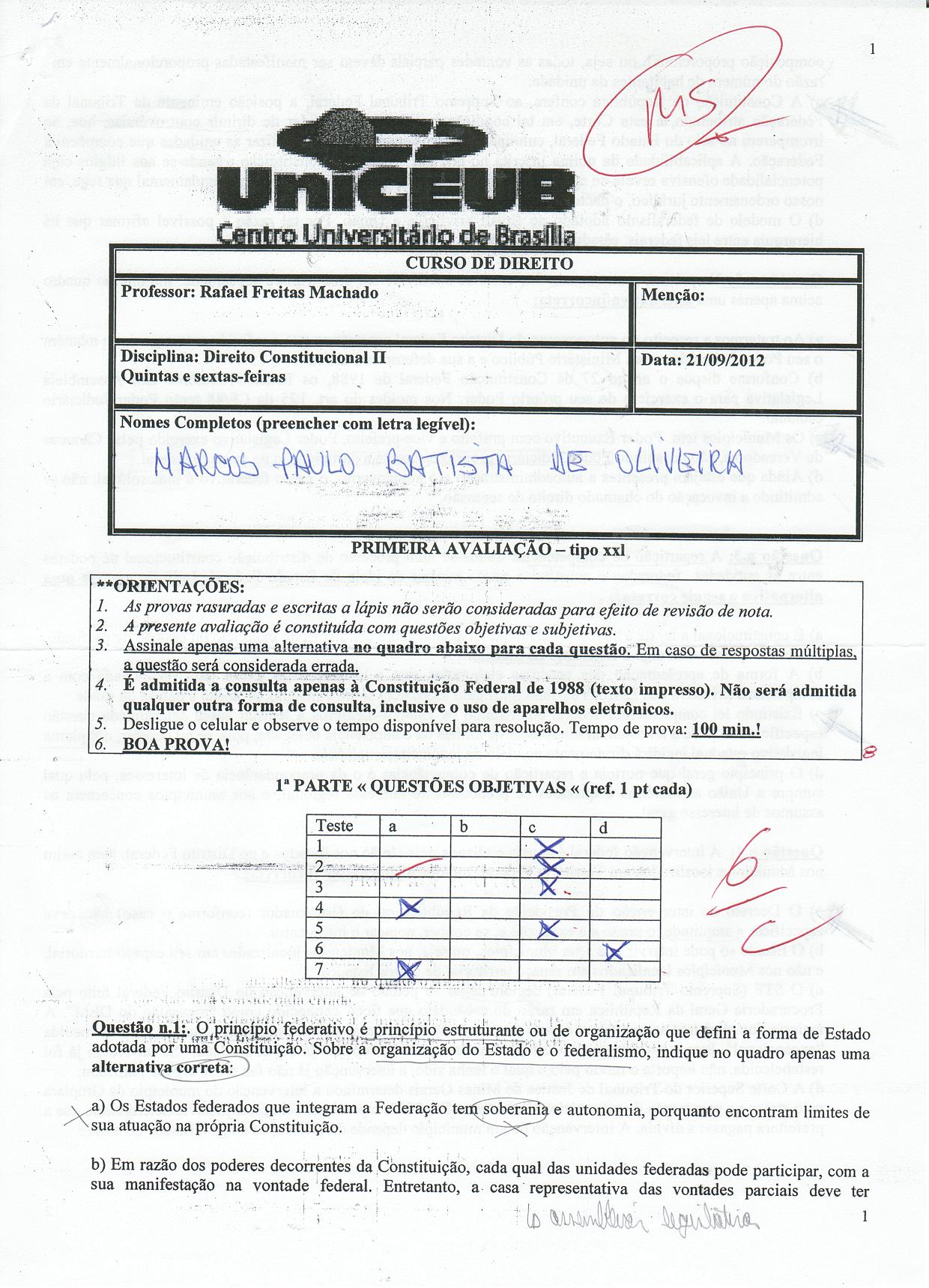 1ª Prova de Direito Constitucional II – 3º Semestre – Menção ‘MS’