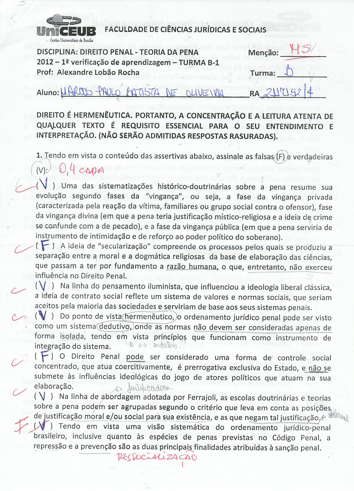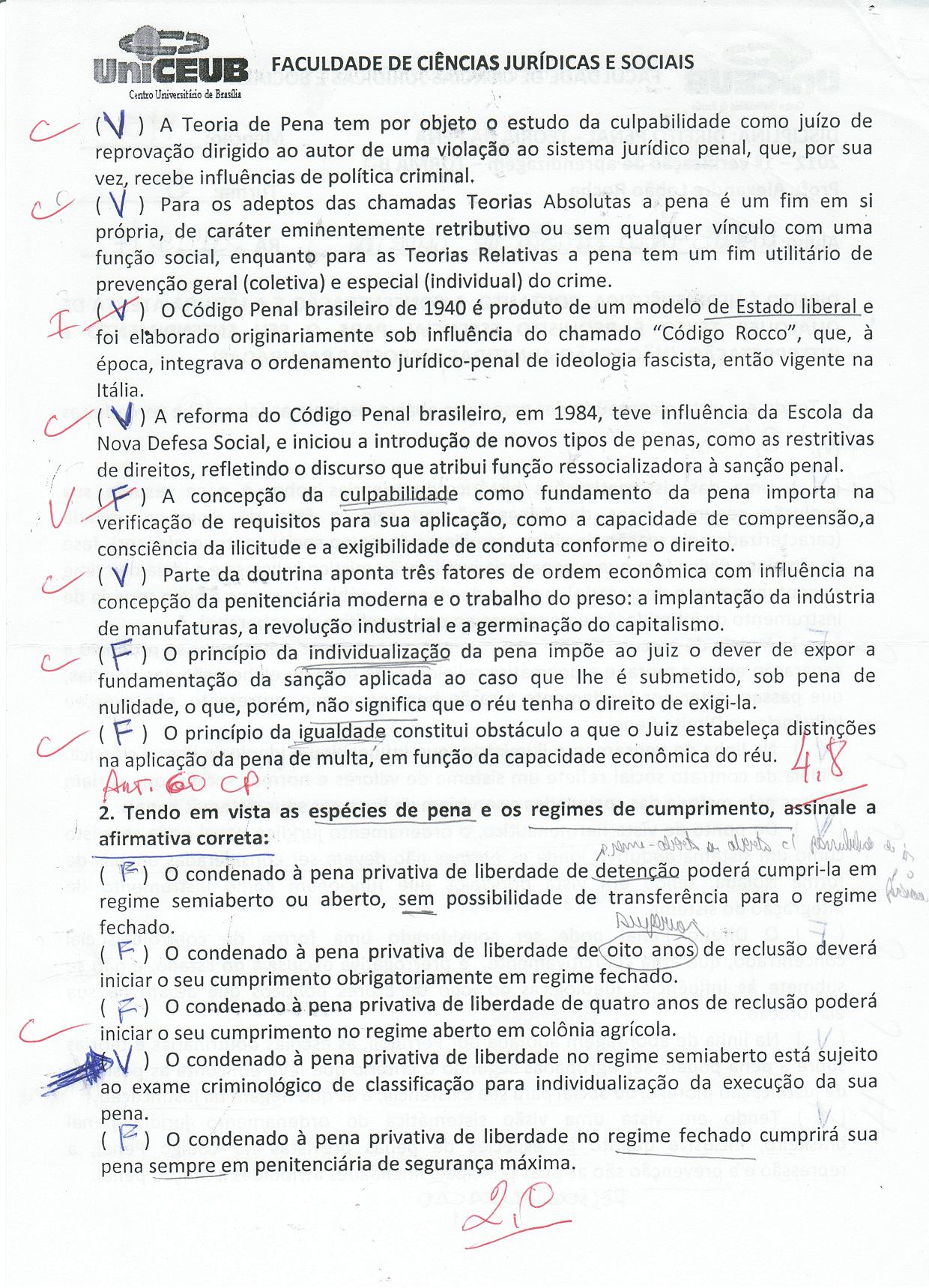 1ª Prova de Direito Penal – Teoria da Pena – 3º Semestre – Menção ‘MS’