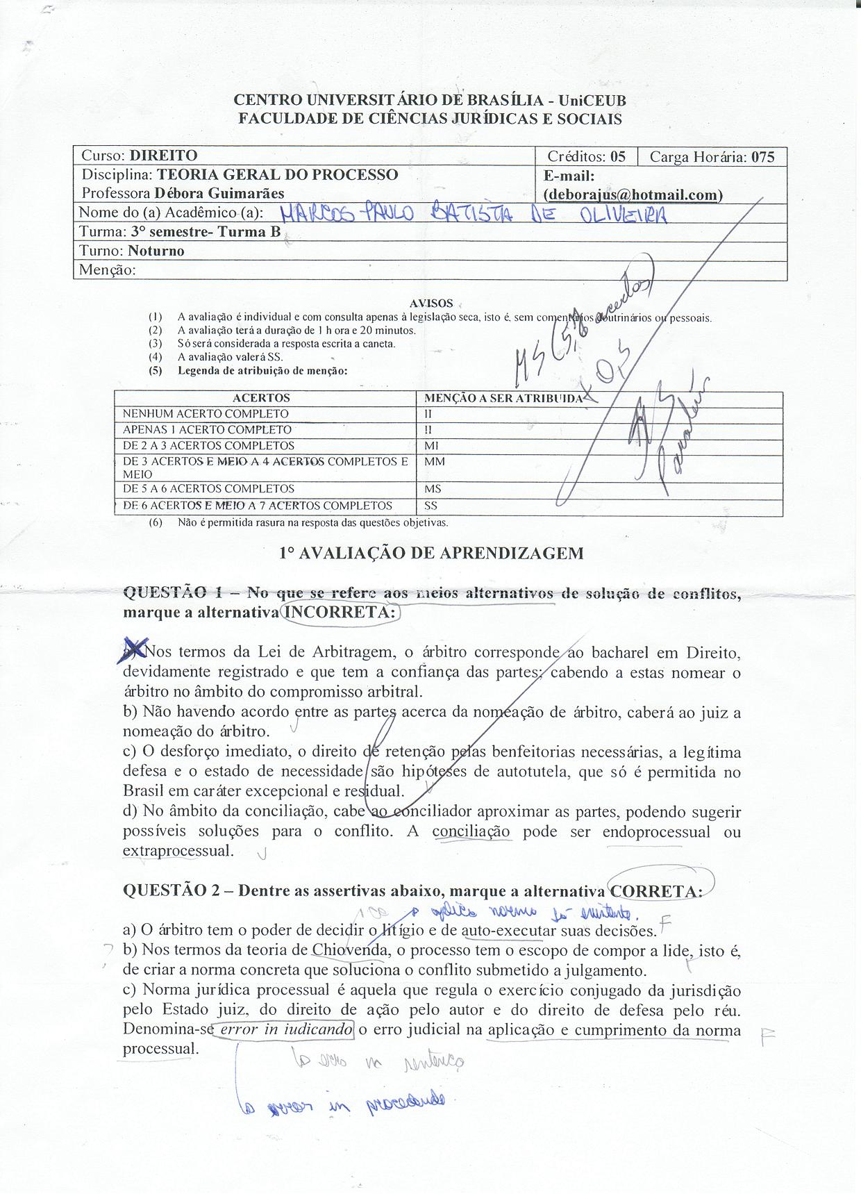 1ª Prova de Teoria Geral do Processo – 3º Semestre – Menção ‘SS’