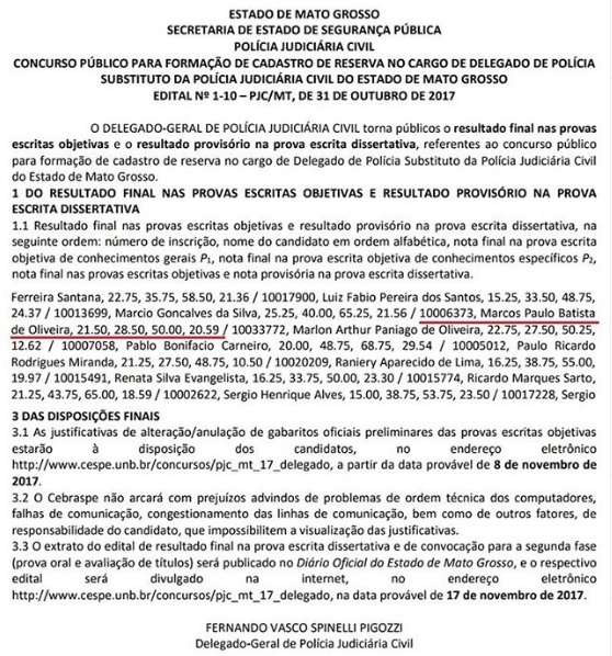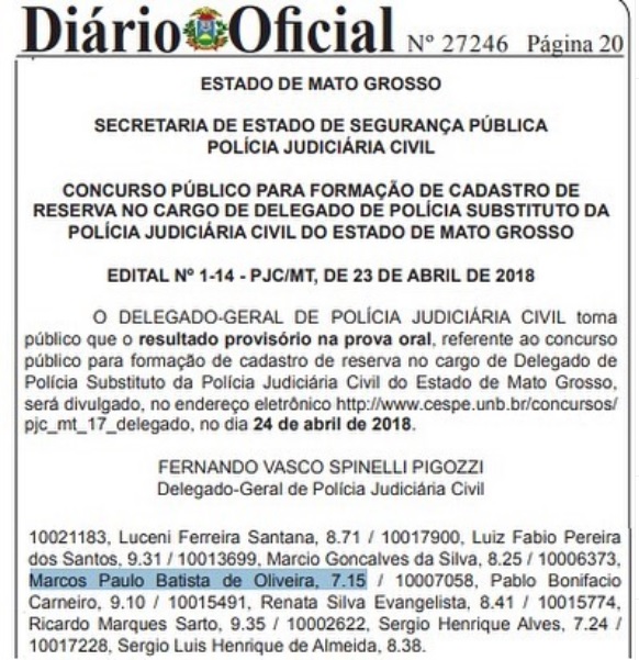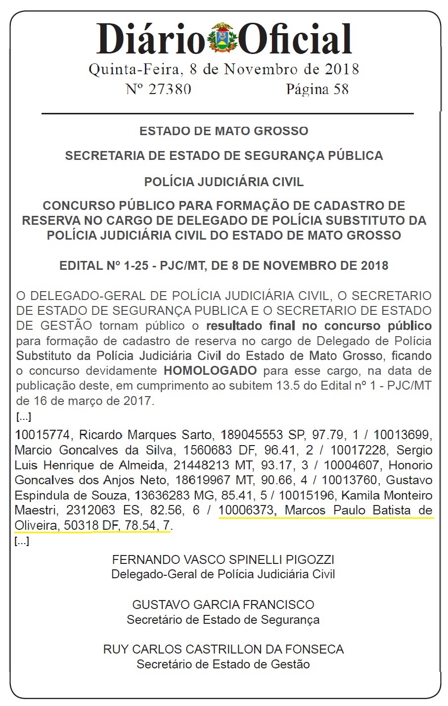 Aprovado no concurso de Delegado de Polícia Substituto da Polícia Judiciária Civil do Estado de Mato Grosso – PJCMT – 2018