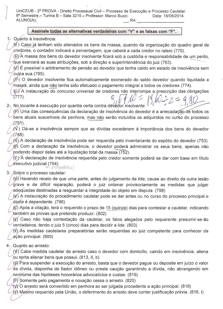 2ª Prova de Direito Processual Civil – Execução e Cautelar – 6º Semestre – Menção ‘SS’