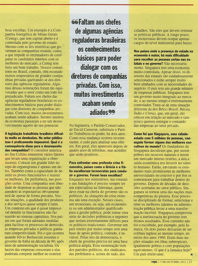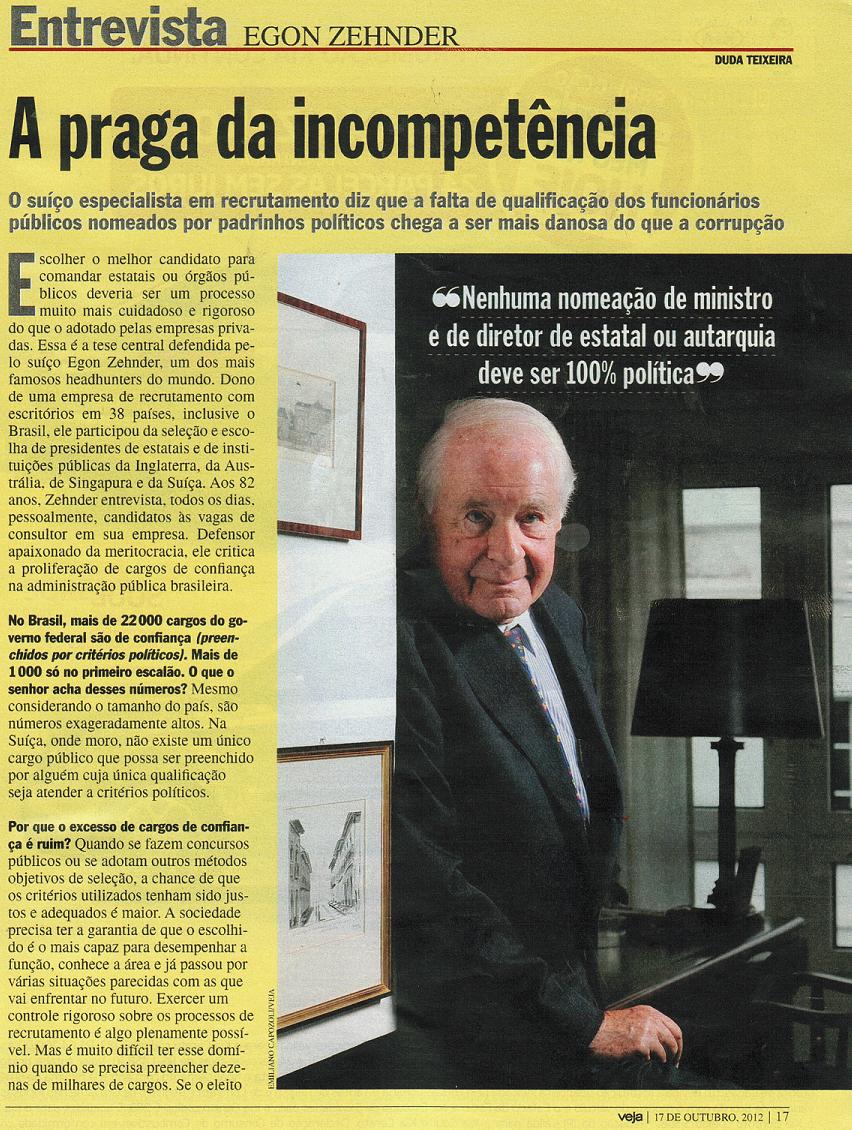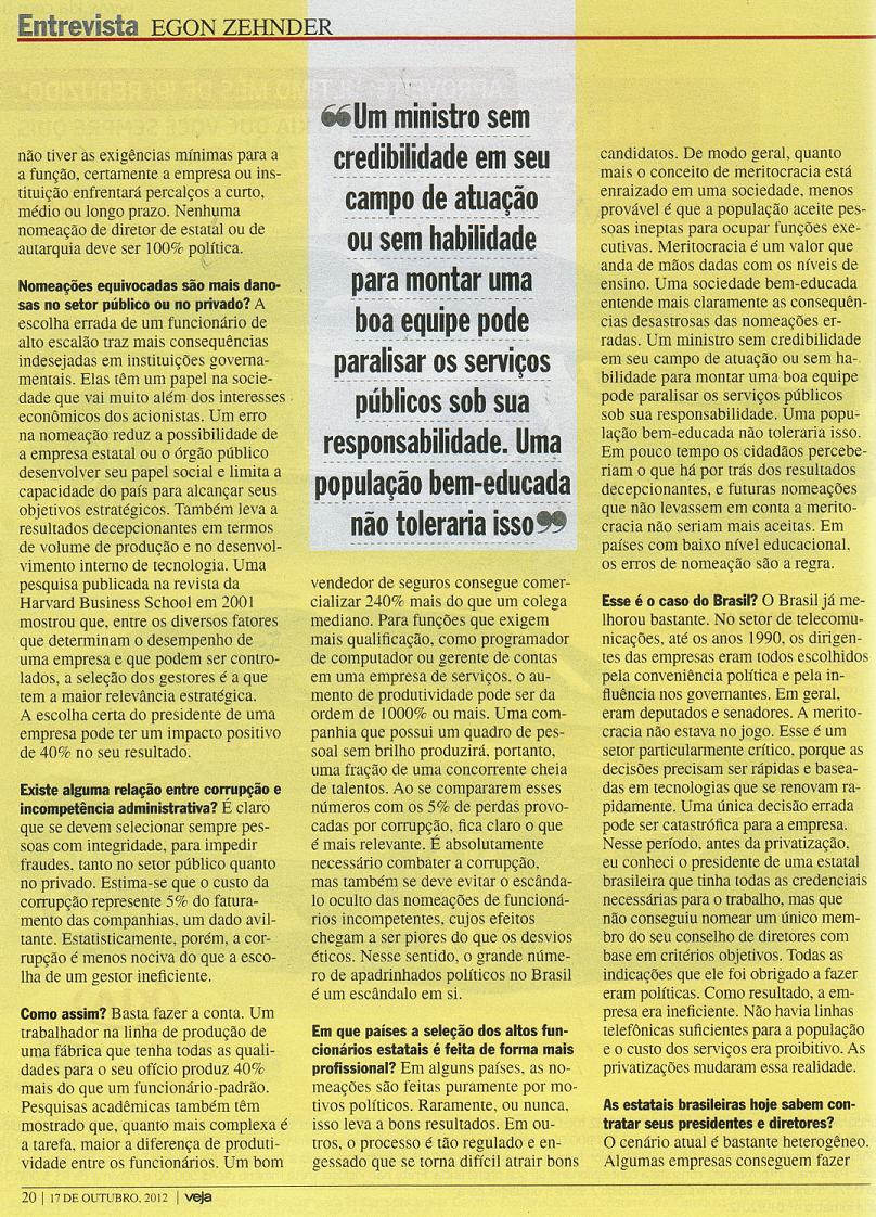 Fiz questão de deixar aqui registrado a excelente e sensata (para não dizer óbvia) entrevista do Dr. Egon, publicada na edição nº 2291 da revista Veja… onde desnuda o mal da indicação política de ‘companheiros’ em postos chaves da máquina administrativa… A atual realidade da grande maioria das empresas estatais do Distrito Federal (vide resultados pífios e o volume crescente de multas aplicadas por órgãos reguladores, por exemplo), infelizmente, corrobora as palavras do entrevistado. Algumas empresas da Capital Federal se transformaram em verdadeiros ‘cabideiros’ repletos de ‘pseudos’ gestores/executivos, que se sentido os ‘paladinos’ da eficiência e arrogância, se aventuram a implementar ações desastradas e projetos totalmente desconexos dos modelos da boa gestão e eficiência, o que, já tem provocado inúmeras consequências danosas para a população do Distrito Federal… Espero viver um dia em que o Brasil se paute pela meritocracia e não tenhamos, como solução para este mal, ‘apenas’ o poder do voto! (sim, esquecem estes ‘gestores’ que a cada 4 anos a população tem o direito constitucional de avaliar os resultados obtidos, renovando ou não os seus contratos de trabalho).