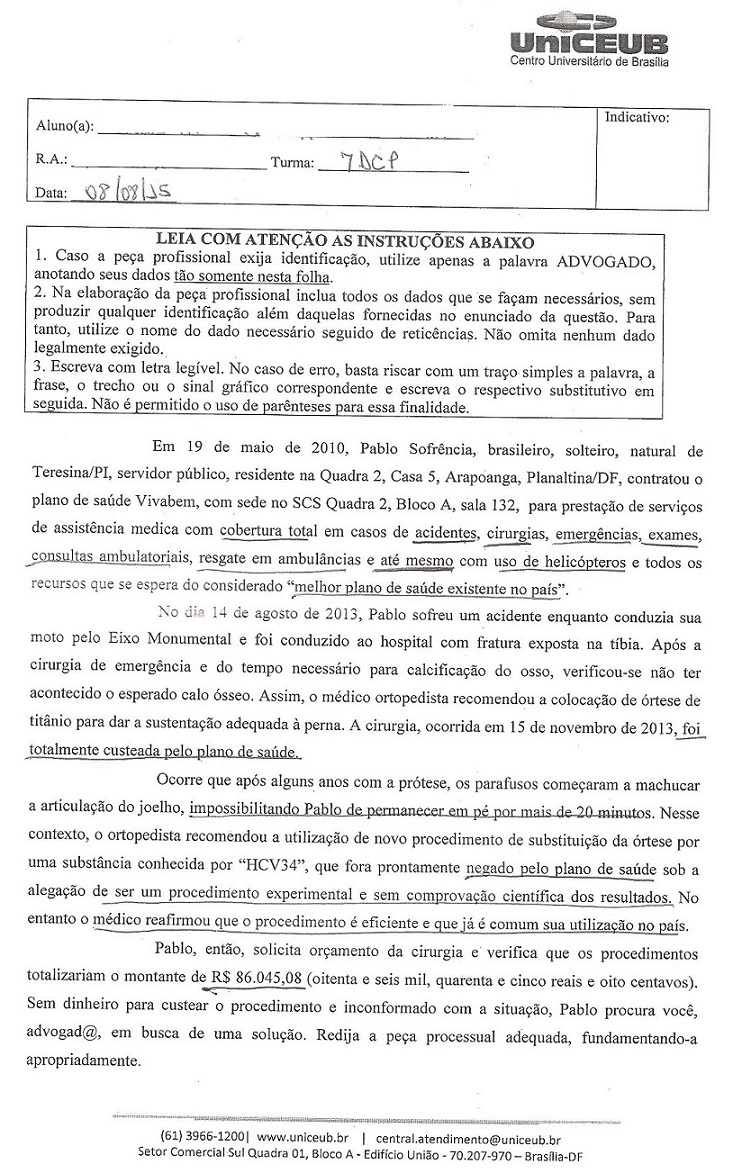 A peça abaixo foi proposta no encontro do dia 08/08/15 (Estágio II – Turma 7DCP). A entrega e correção da peça confirmaram as minhas expectativas, ou seja, que me saí muito mal. Obtive uma avaliação como ‘inapta’. A utilização do Novo Código de Processo Civil conjugado com o grau de exigência do professor Caio, contribuíram para esse resultado.