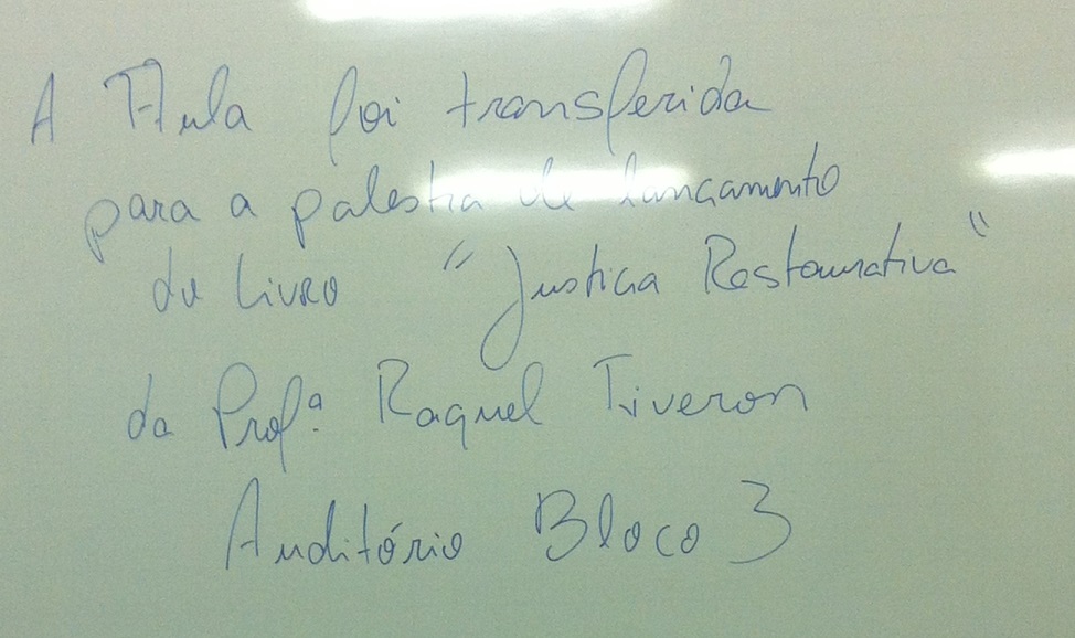 Em função da palestra de lançamento do livro da Profª Raquel Tiveron, ocorrida no auditório do bloco 3, o professor liberou a turma para que pudéssemos comparecer neste evento.