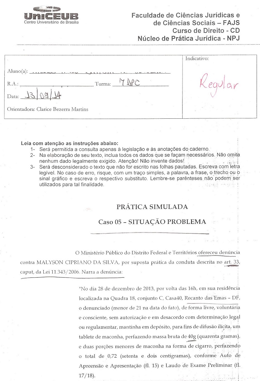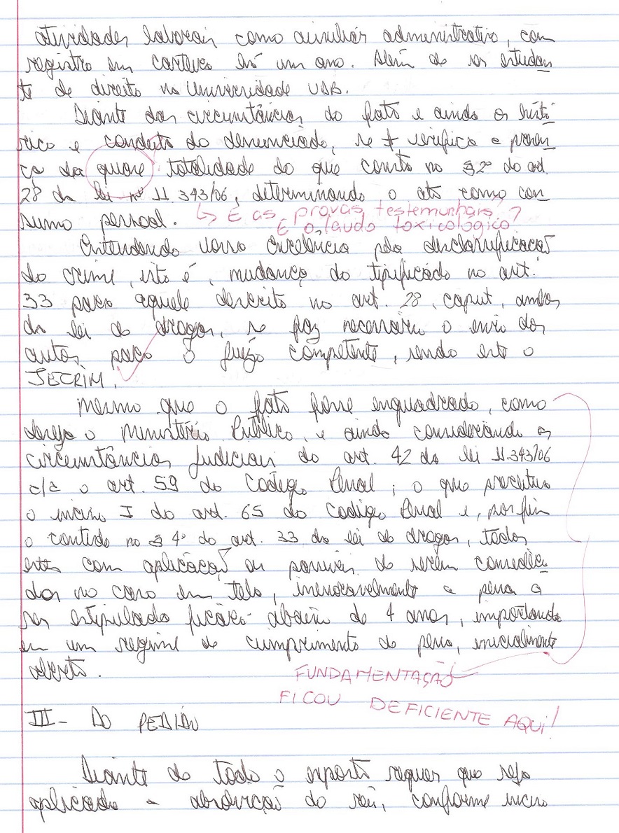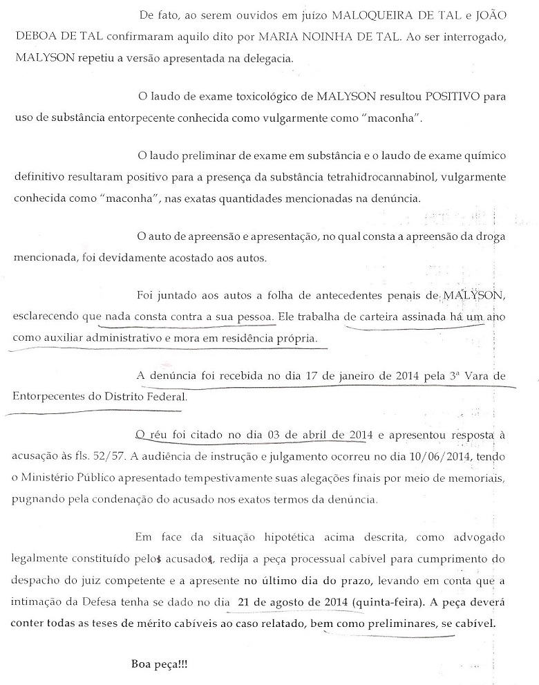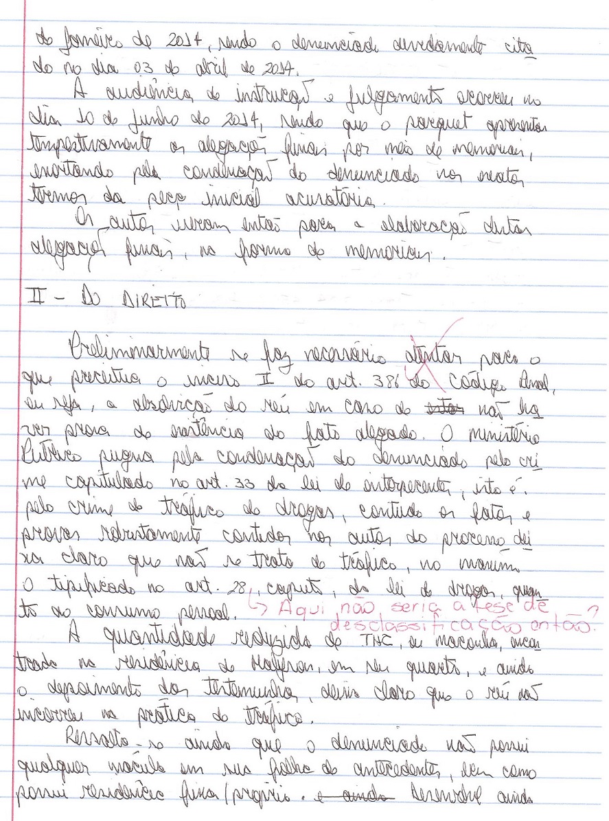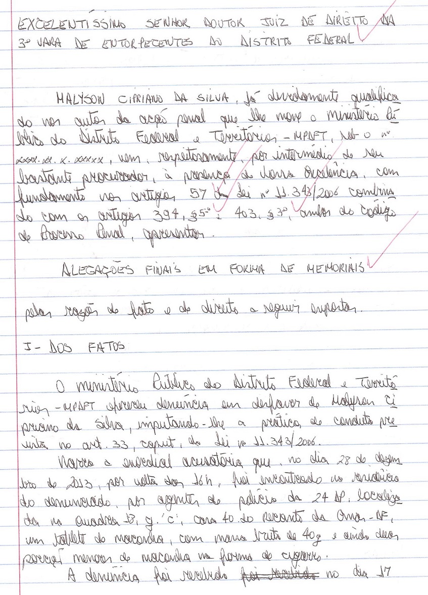 Passando para as atividades de fato, iniciou-se com a correção da peça entregue na aula anterior, ou seja, RESPOSTA À ACUSAÇÃO. Ao mesmo tempo que corrigia, a professora foi pontuando como deveria ser o desenvolvimento da peça de hoje – ALEGAÇÕES FINAIS EM FORMA DE MEMORIAL (crime de tráfico de drogas, lei nº 11.343/06).