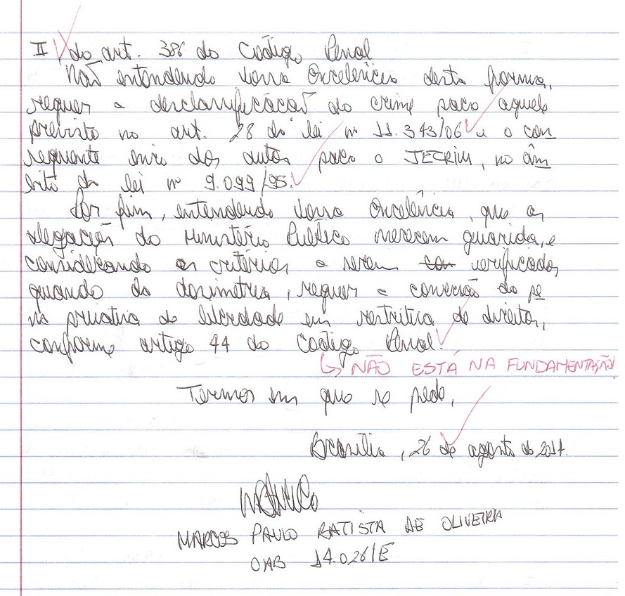 Abaixo consta a peça elaborada nesta aula (Alegações finais em forma de memoriais), na qual obtive menção ‘regular’. Nota esta já esperada, pois não tive como me dedicar mais no desenvolvimento da peça.