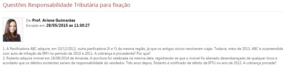 Abaixo, consta mensagem encaminhada pela professora, onde propõe questões referente a responsabilidade tributária (uma questão semelhante a esta será objeto de cobrança na 2ª prova).