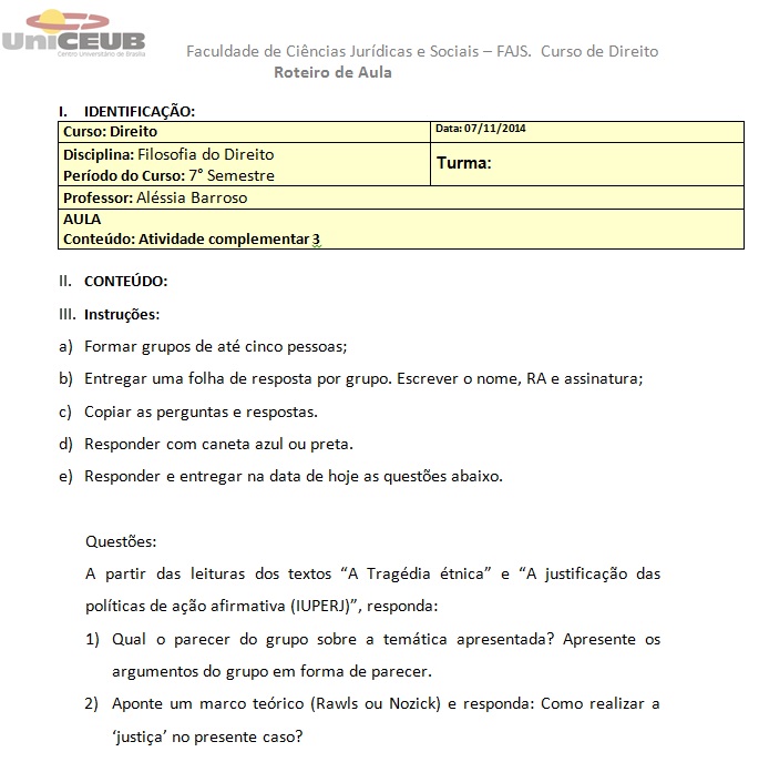 Nesta aula foi aplicada a Atividade Complementar 3, conforme abaixo:
