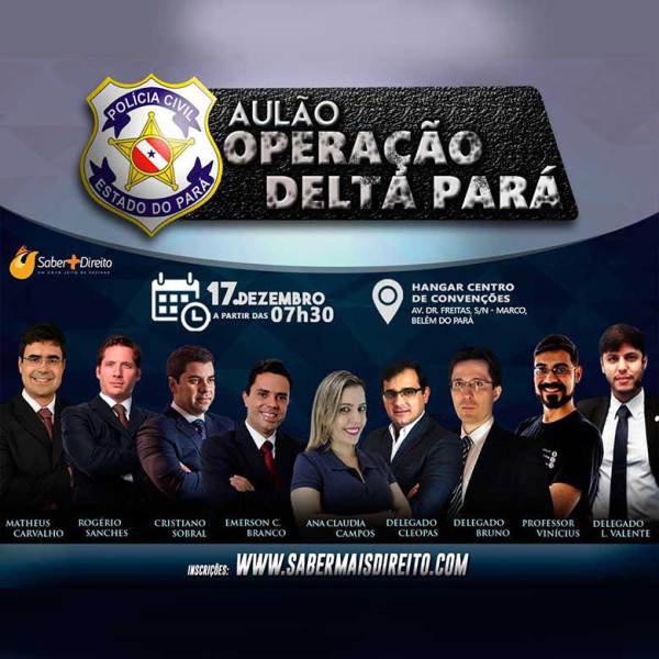 O Aulão Operação Delta Pará para o concurso de Delegado de Polícia do Saber Mais Direito abrangerá os pontos mais relevantes das disciplinas cobradas, com foco na legislação, na doutrina e exercícios preparando os candidatos para alcançarem maior pontuação na prova objetiva e avançarem para a próxima etapa.