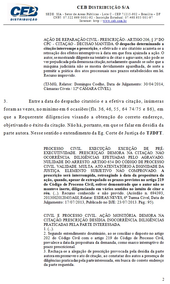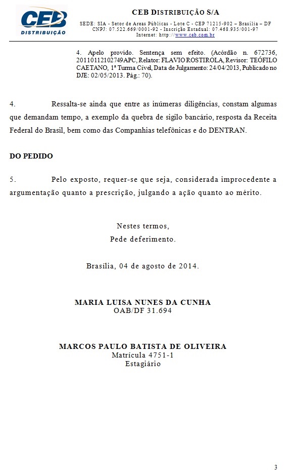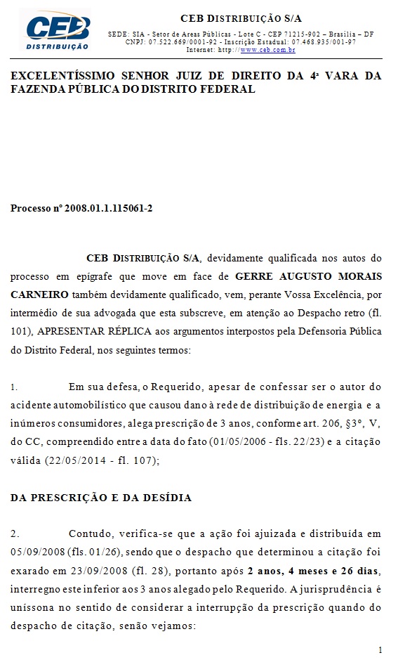 – Concluí hoje, após um processo de pesquisa de jurisprudência e um re-estudo sobre o instituto da prescrição, a elaboração de Réplica, referente ao processo nº 2008.01.1.115061-2. Após a análise da minha ‘tutora’, Dra. Maria Luisa, que não fez nenhuma retificação, a peça foi aprovada in totum.