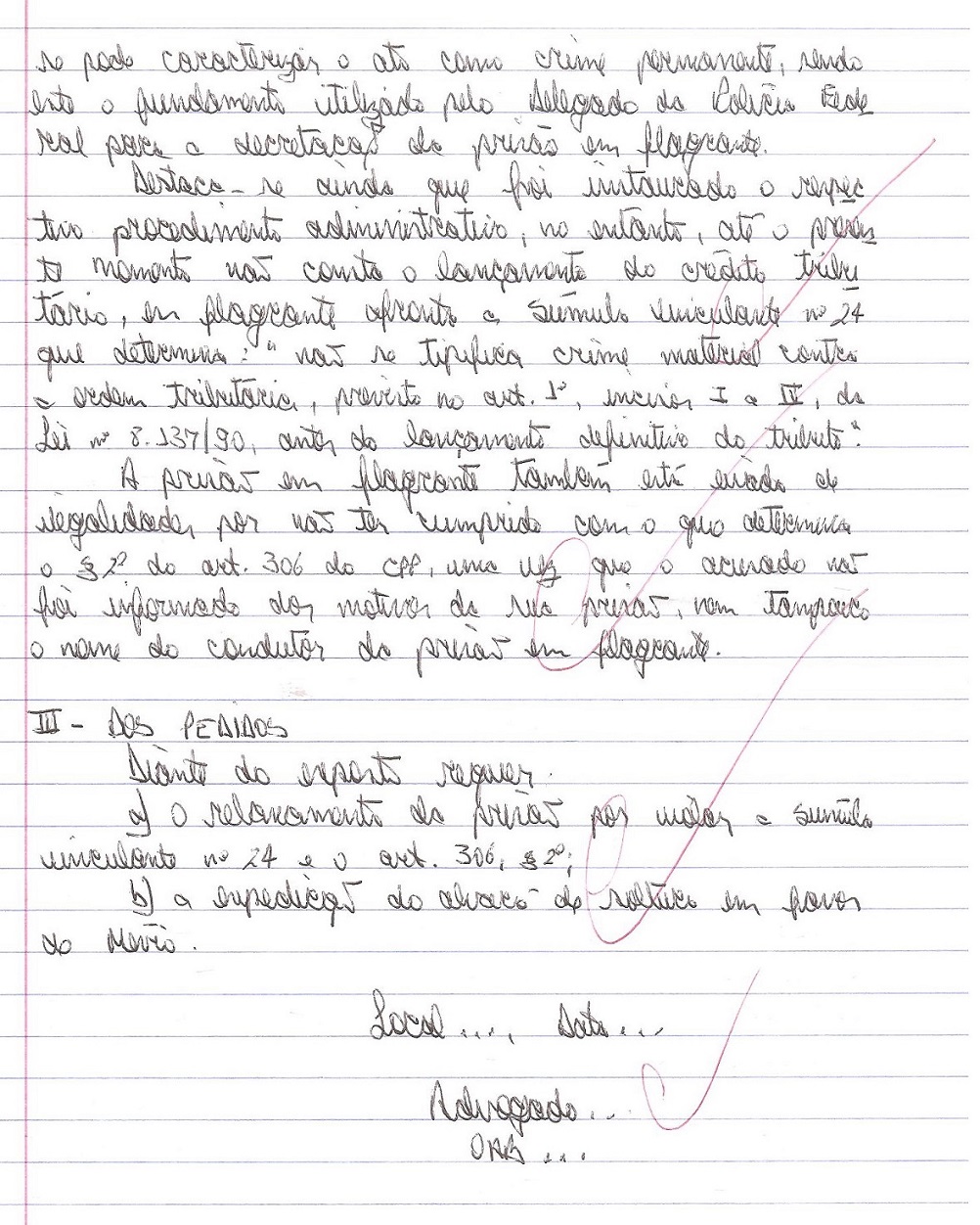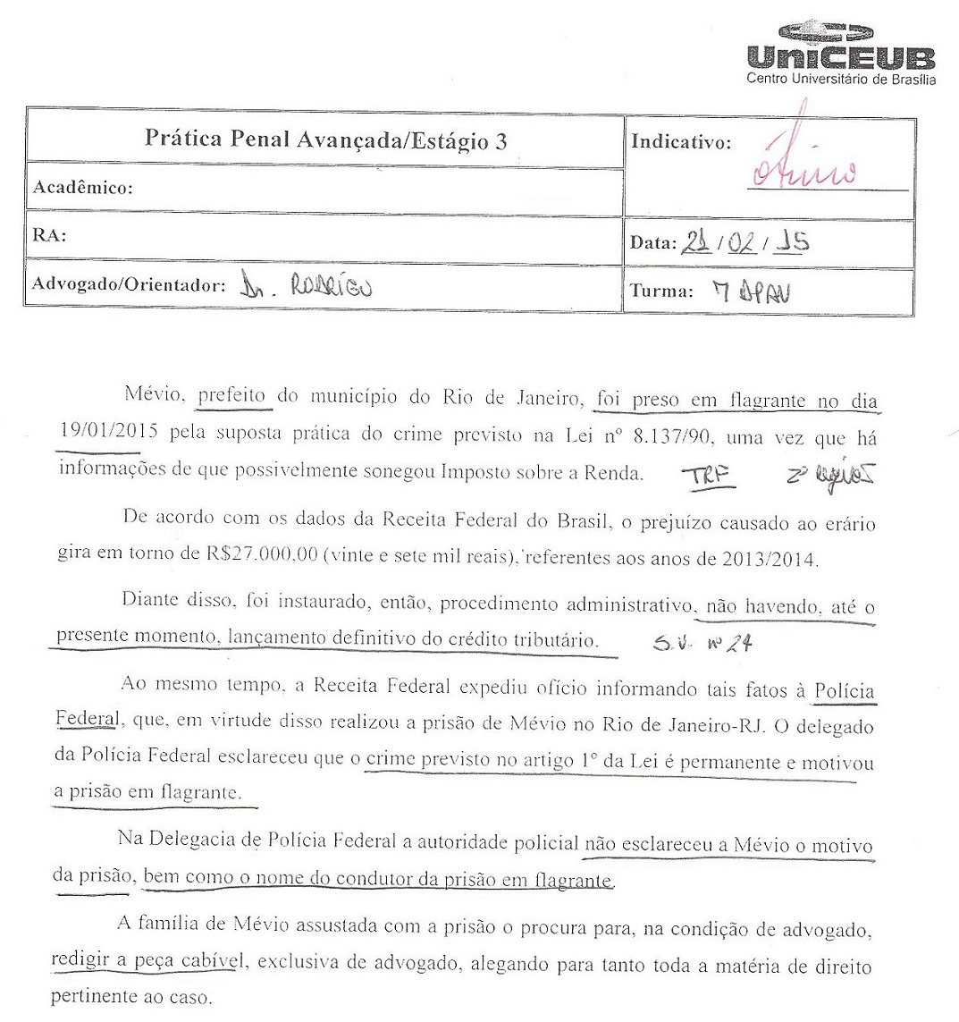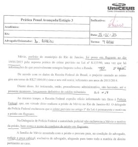 No encontro do dia 28.02.15, durante o Estágio III, o professor fez a correção e a entrega da peça realizada na última semana, que tratou do Relaxamento de Prisão… Pela primeira vez obtive uma menção ‘ótimo’. Bons presságios…