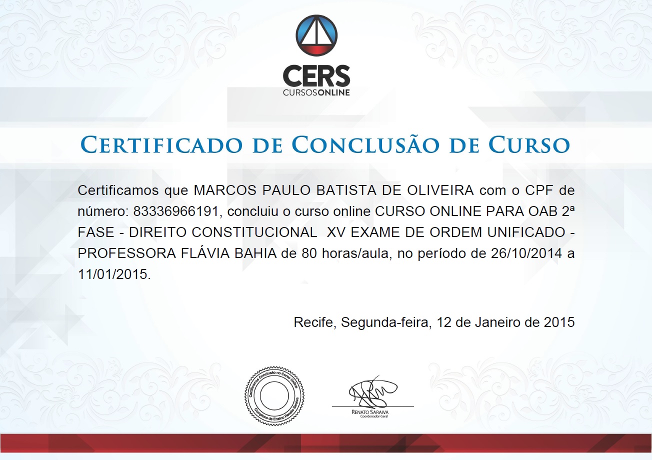 Com toda a certeza, o sucesso da minha aprovação no XV Exame de Ordem da OAB se deveu, em grande parte, a realização deste curso!