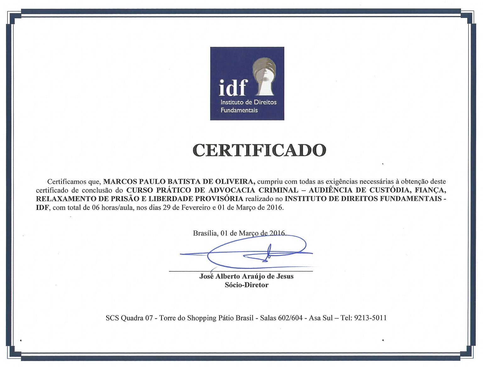 29/03 a 01/03/16 – Curso – Prática de Advocacia Criminal – IDF – Brasília – DF
