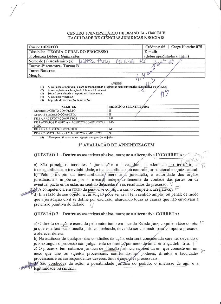 2ª Prova de Teoria Geral do Processo – 3º Semestre – Menção ‘MS’