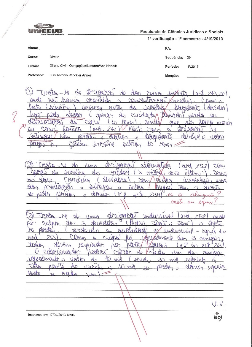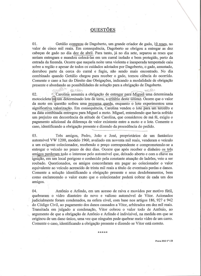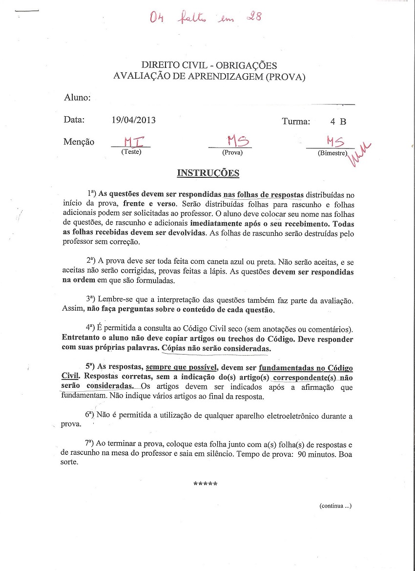 1ª Prova de Direito Civil – Obrigações – 4º Semestre – Menção ‘MS’