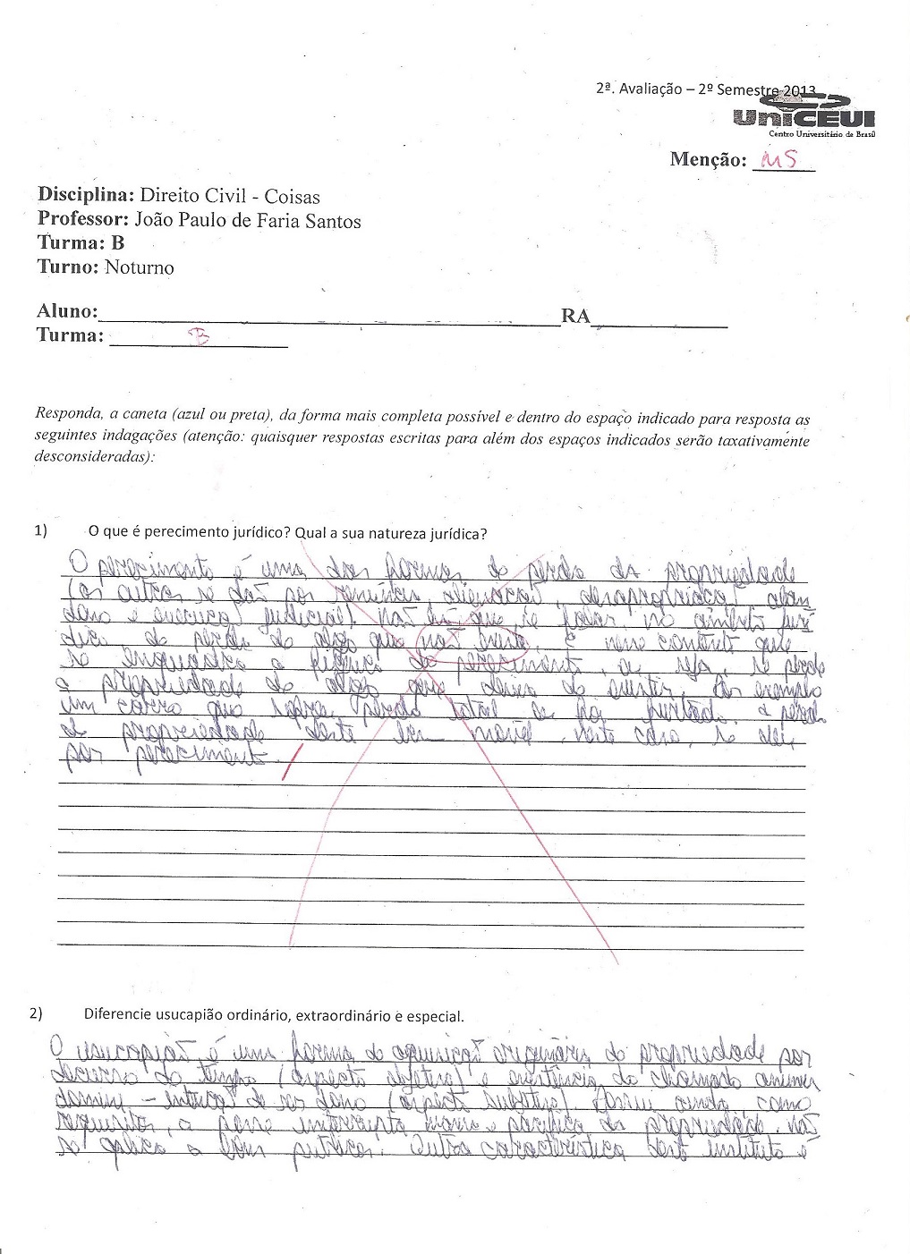 2ª Prova de Direito Civil – Coisas – 5º Semestre – Menção ‘MS’