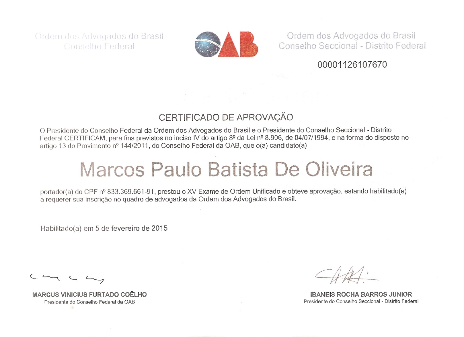 #9 – XV Exame OAB – Certificado de aprovação emitido – 16.04.15