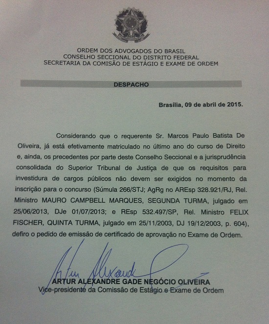 Diante de negativa, fui obrigado a, administrativamente, requerer o deferimento para a emissão do certificado. Sustentei, basicamente, que quando da publicação do resultado eu já estava no 9º semestre e ainda levantei o entendimento da Súmula 266 do STJ… Após alguma apreensão, recebi hoje a notícia do deferimento do meu requerimento, ato contínuo, providenciei a retirada do meu Certificado de Aprovação no XV Exame de Ordem! Agora é concluir o curso e solicitar a emissão da tão desejada Carteirinha da Ordem!