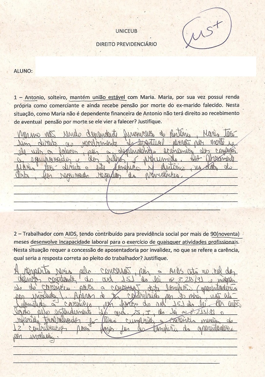 1ª Prova de Direito Previdenciário – 8º Semestre – Menção – ‘MS+’