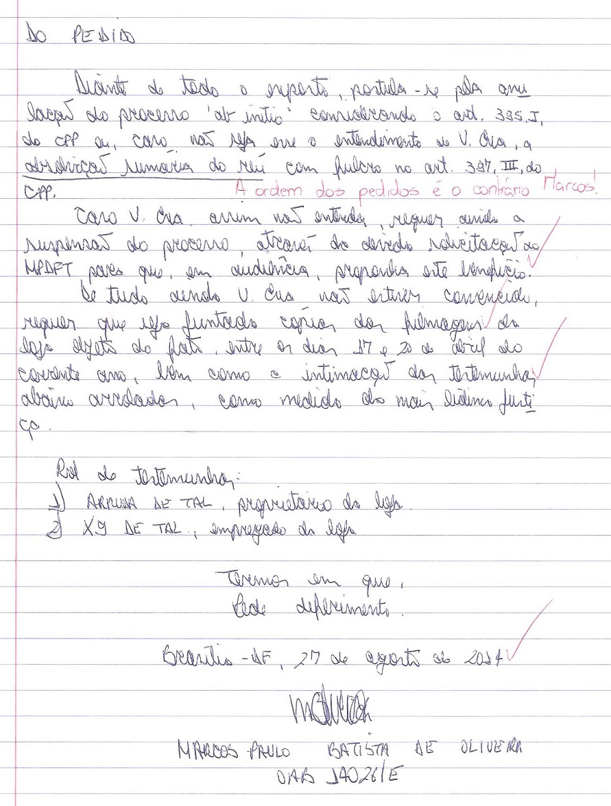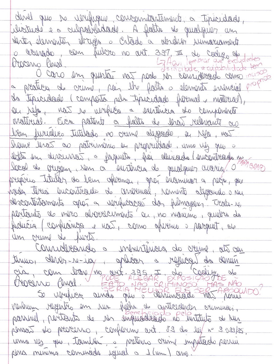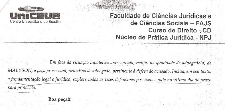 Frases proferidas: ‘Ao contrário do civil, no penal há poucas peças processuais’, ‘Se na instrução do caso, constar como sendo do MP, a peça cabível é uma denúncia e não queixa-crime, por exemplo’, ‘Na queixa-crime o ofendido pode ingressar com a ação tanto no local da sua residência, quanto no local da consumação (art. 73, CPP)’, ‘Não é para abreviar nada nas peças, vocês ainda estão aprendendo! Quando tiverem com a carteirinha da OAB em mãos, aí sim vocês podem abreviar’, ‘Quando há concursos de crime, soma-se as penas para se definir a competência’, ‘Nas peças de defesa não precisa fazer a qualificação pois na acusação/denúncia isso já foi feito’, ‘Advogados não falam por meio deste, mas sim venho à presença de V. Exa ou perante V. Exa‘, ‘Na queixa-crime não se costuma dividir a fundamentação (dos fatos, do direito…), pois é uma peça acusatória e, portanto, não tem atos processuais’, ‘Quando for fazer uma peça acusatória, faça tudo junto’, ‘Façam parágrafos curtos!’, ‘É interessante incluir a motivação do crime, pois pode-se configurar agravante (art. 61, II, ‘a’, CP)’.