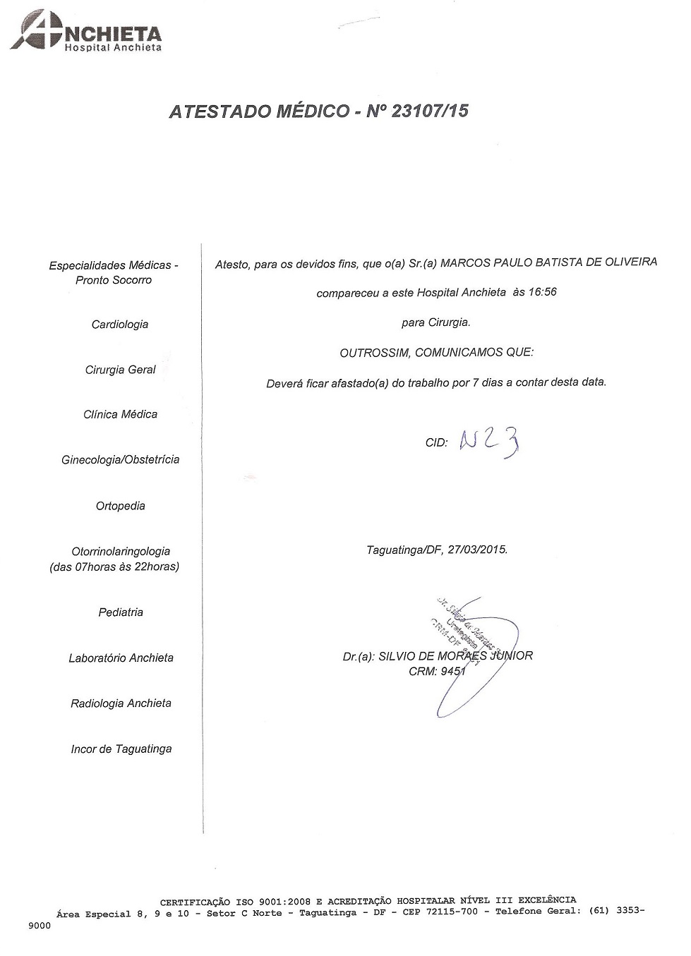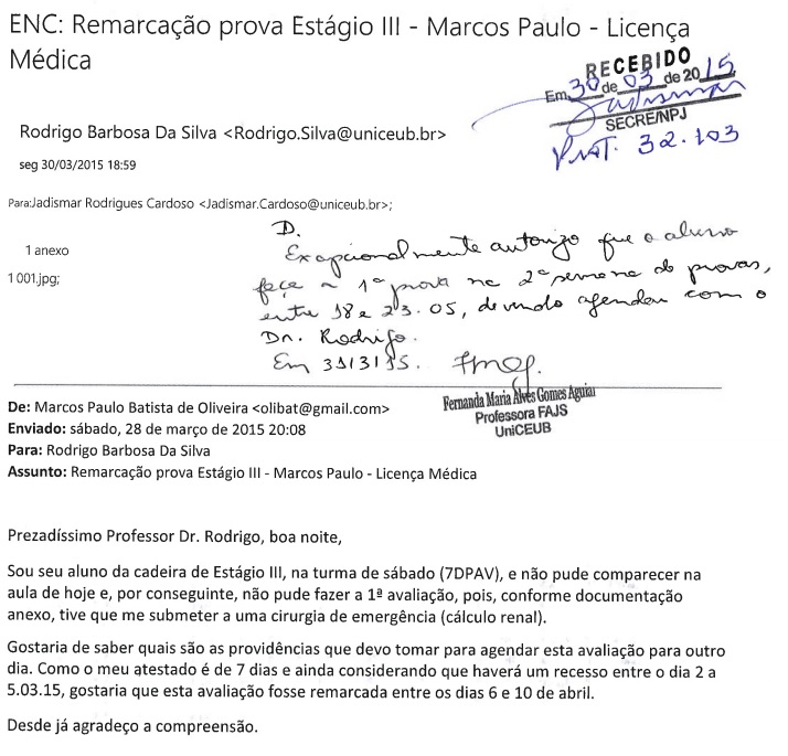 Hoje foi aplicada a primeira avaliação do semestre, na cadeira de Estágio III, contudo, em função de ter me submetido a uma cirurgia de emergência, não pude comparecer… Encaminhei email para o Professor Dr. Rodrigo, explicando a situação e requerendo a remarcação da prova.