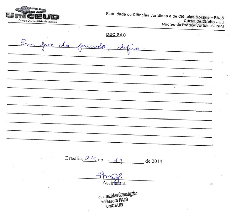 Também tive um requerimento indeferido, para fins de realização de uma 3ª atividade extra, com o respectivo cômputo das horas na carga horária total. A justificativa do indeferimento foi que ‘o aluno não comprovou o alegado’, em total desacordo com o ‘bom senso’ e a ‘razoabilidade’, visto que, s.m.j., uma instituição de ensino superior deve prezar pela qualidade na formação dos seus docentes e não ser uma ‘entidade burocrática’ qualquer, que faz de tudo para prejudicar os ‘seus clientes’, como é o que parece, pelo menos ultimamente, o UniCEUB. Em todo caso, em função do feriado do dia 15.11.14 protocolei outro requerimento, alegando que preciso realizar outra atividade extra, para completar a carga horária, e que não necessitaria caso não tivesse tido a coincidência da aula com o feriado de Proclamação da República. Espero que não indefiram este pedido sob o argumento de que ‘o aluno não comprovou o alegado’.