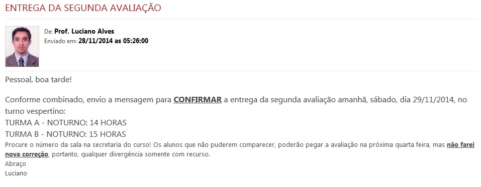 Nesta aula, extraordinária, em pleno sábado, o professor fez a correção e a entrega da 2ª prova… E, felizmente, consegui obter um salvador ‘MM’ que em composição com o ‘MS’ do primeiro bimestre, salvo melhor entendimento, creio que ficarei com um ‘MM’ como menção final.