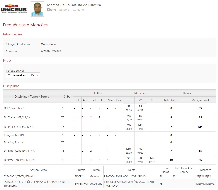 Abaixo, como de costume e pela derradeira vez, consta o meu desempenho acadêmico… Confesso que não esperava obter menções tão boas… planejava obter menções medianas, mas sem o ‘fardo’ da obrigatoriedade de ser aprovado na OAB e na defesa do Trabalho Final (etapas vencidas no primeiro semestre deste ano), pude me dedicar mais nas matérias deste semestre…
