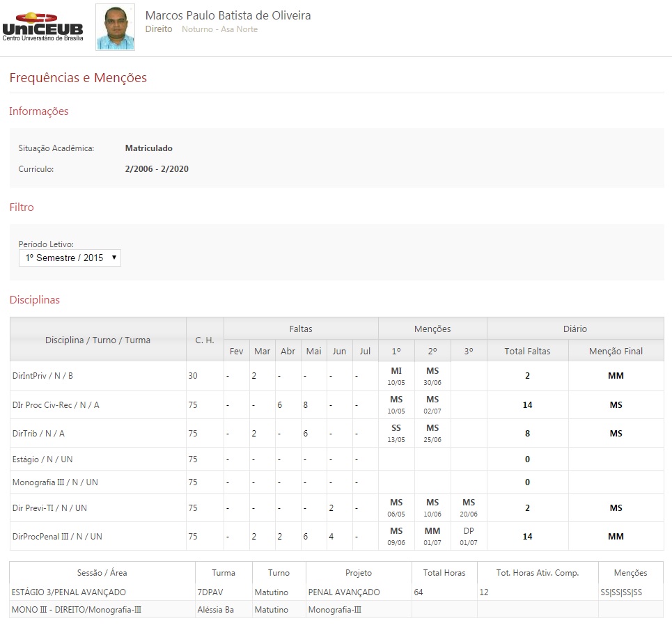 Abaixo, seguindo o procedimento adotado nos semestres anteriores, consta o meu desempenho acadêmico auferido neste 8º semestre do curso de Direito, o penúltimo até a formatura. As menções já não são as mesmas verificadas quando do início do curso, nem tampouco a assiduidade… Motivos são vários para esta mudança de ‘performance’, dentre os quais o próprio processo de ‘desligamento’ da vida acadêmica para a vida profissional, conjugado com a rotina diária que envolve trabalho, viagens, contratempos…