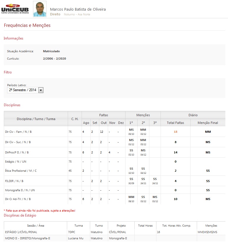 Abaixo o desempenho, traduzido em menções, das cadeiras cursadas… Apesar do número de disciplinas, o máximo permitido pelo UniCEUB, e ainda considerando as faltas que tive visto alguns problemas pessoais e uma viagem ao exterior, creio que me saí relativamente bem, conseguindo apreender o necessário de cada área/ramo estudado.