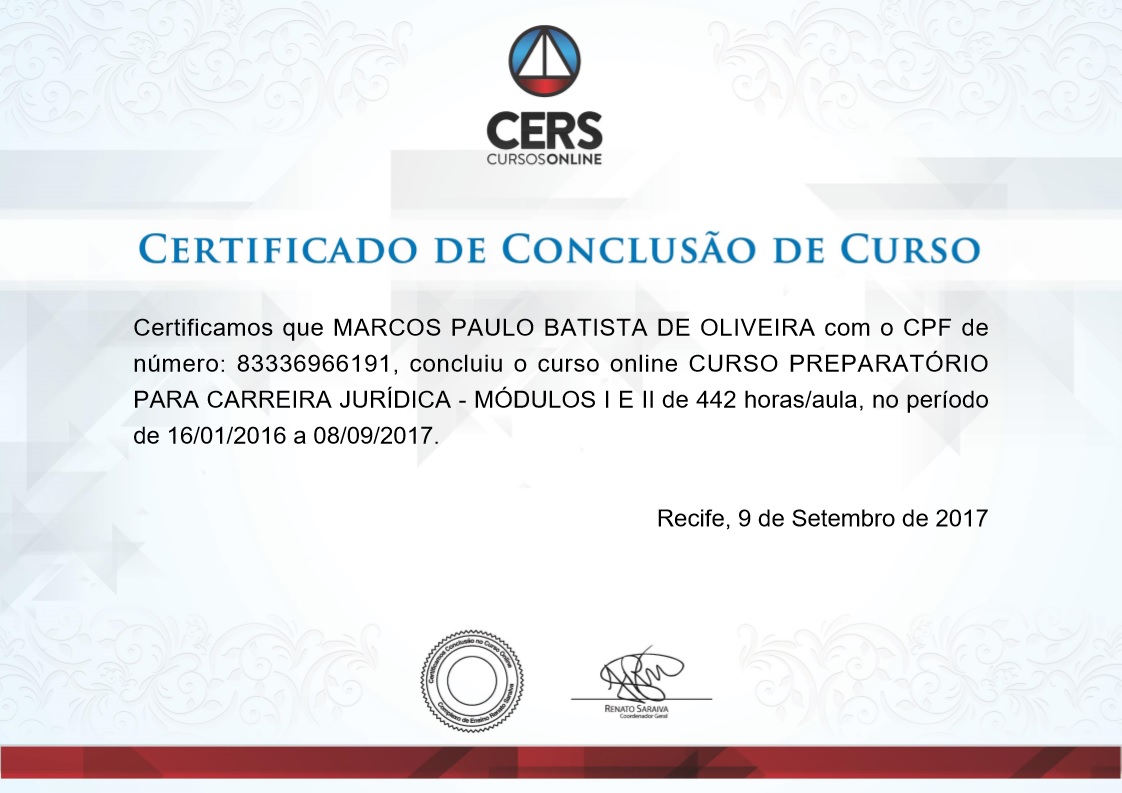 Com alguns percalços consegui concluir mais um curso, na busca constante da preparação para a magistratura… agora é focar nas duas pós (direito previdenciário e segurança pública), warm-up nos concursos de delta e, a partir e março de 2018, encarar os concursos de magistratura.