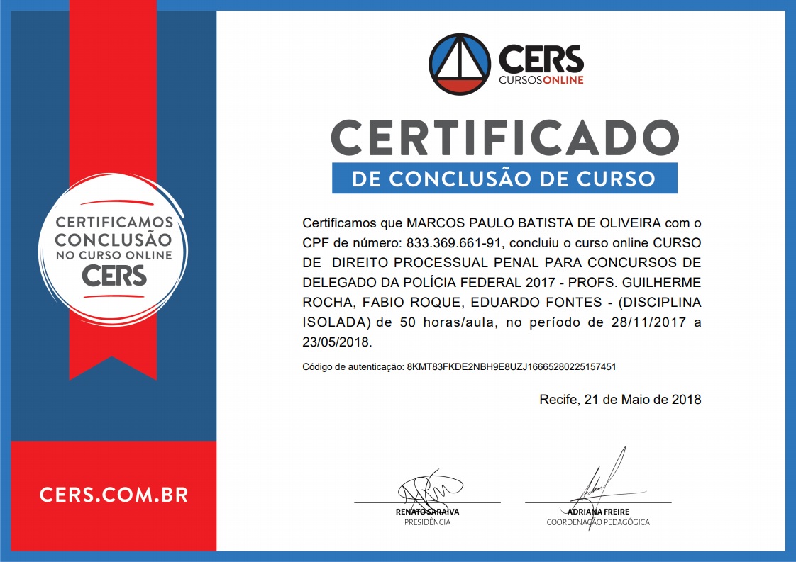 Certificado de Conclusão – Direito Processual Penal – CERS – Nov/17 a Mai/18