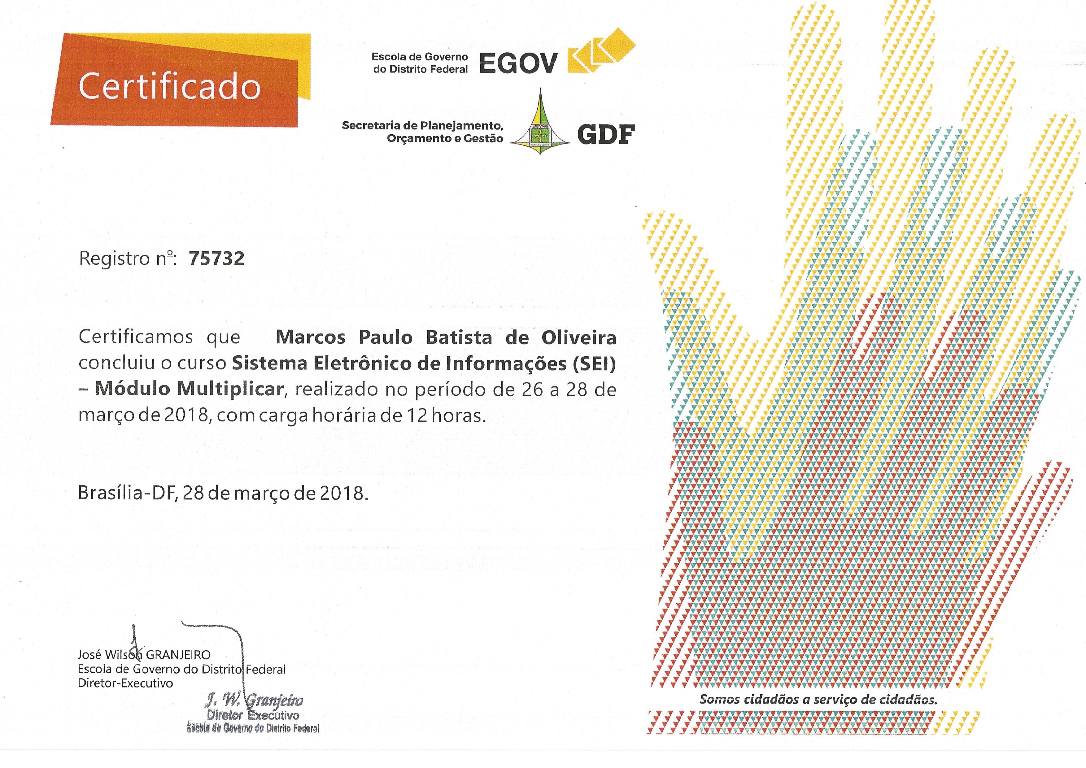 Certificado de Conclusão – SEI – Sistema Eletrônico de Informações – Módulo Multiplicar – EGOV – Março/2018