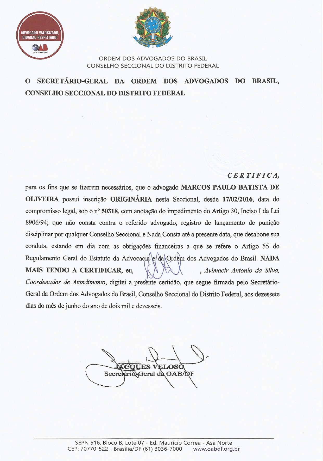 Data da colação: 27/01/2016 – Certificado OAB-DF