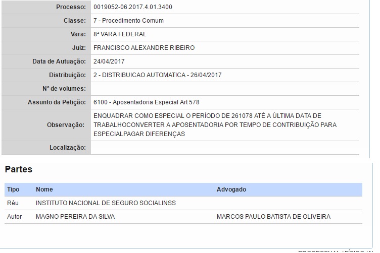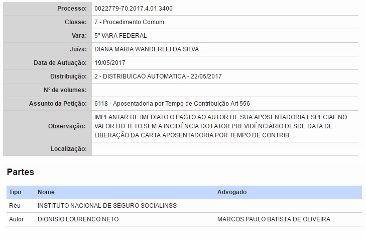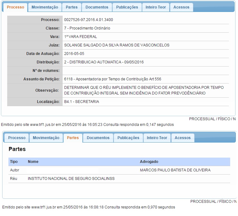 b) Ação Previdenciária – Procedimento Ordinário – Aposentadoria por Tempo de Contribuição – 1ª Vara Federal da Seção Judiciária do Distrito Federal – Processo nº 0027526-97.2016.4.01.3400 – Data 05/05/2016.
