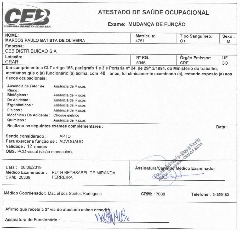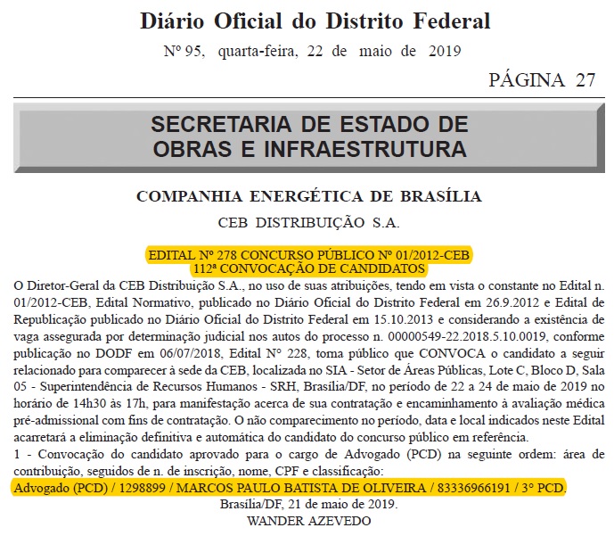 ADVOGADO PÚBLICO: Com a convocação e posse para o cargo de advogado público (de empresa de economia mista – CEB Distribuição S/A), a partir do dia 10/06/2019, esse requisito quanto ao número de ações/atos praticados, se tornou irrelevante, visto que na condição de advogado público, inúmeras são as ações das quais tive atuação direta como advogado. Abaixo constam os atos da minha convocação e posse nesta nova função.