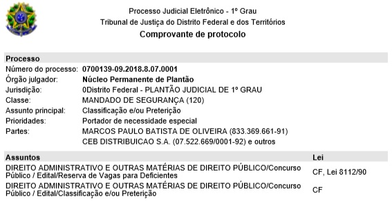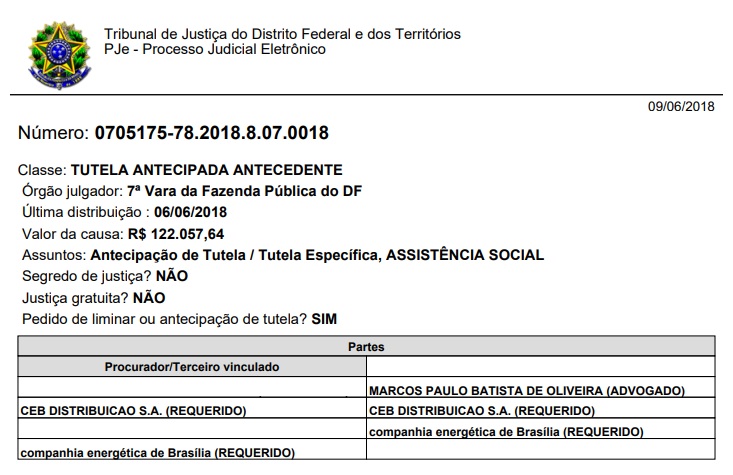 3.1 – Mandado de Segurança (CF, Lei nº 12.016/2009) em face da CEB Distribuição S.A., Distrito  Federal e outros – Direito Constitucional – 7ª Vara da Fazenda Pública do DF – TJDFT – Processo nº 0700139-09.2018.8.07.0001 – Data 05/01/2018.