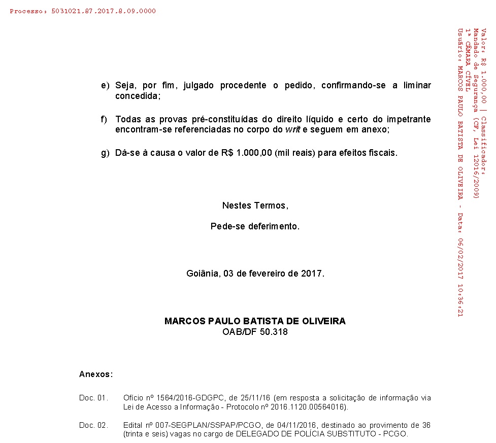 2.2 – Mandado de Segurança (CF, Lei nº 12.016/2009) em face do Estado de Goiás (Secretário Estadual de Gestão e Planejamento) – Direito Constitucional – Competência Originária das Turmas Cíveis do TJGO – Processo nº 5031021.87.2017.8.09.0000 – Data 03/02/2017.