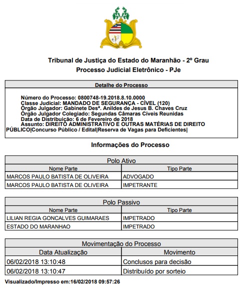 3.2 – Mandado de Segurança (CF, Lei nº 12.016/2009) em face do Estado do Maranhão e da Titular da Secretaria de Estado de Gestão, Patrimônio e Assistência dos Servidores – Direito Constitucional – Reserva de Vagas para Deficientes em concurso público – TJMA – Processo nº 0800748-19.2018.8.10.0000 – Data 06/02/2018.