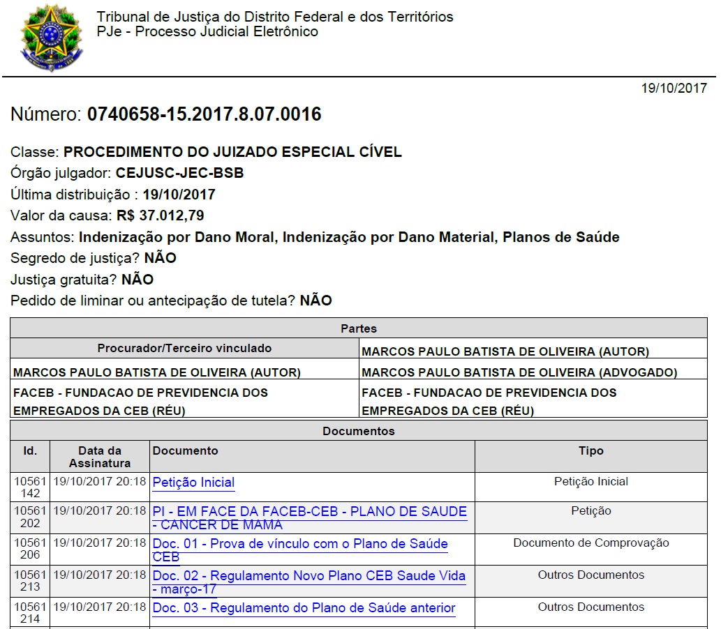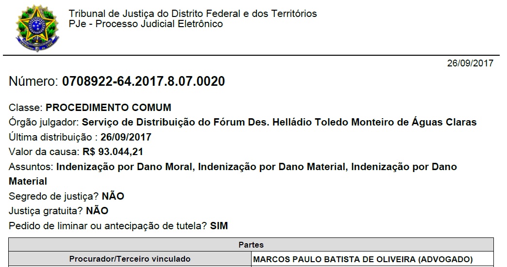 2.9 – Ação Indenizatória – 5º Juizado Especial Cível de Brasília – Ação acima de 20 Salários Mínimos – Processo nº 0740658-15.2017.8.07.0016 – Data 19/10/2017.