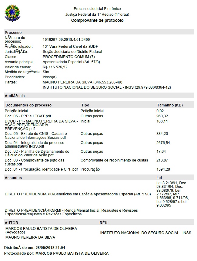 3.3 – Ação Previdenciária – Procedimento Ordinário – Revisão de Aposentadoria – Direito Previdenciário – 13ª Vara Federal da Seção Judiciária do Distrito Federal – Processo nº 1010297-39.2018.4.01.3400 – Data 28/04/2018.
