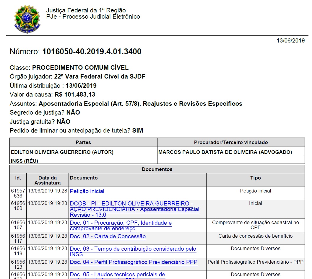 4.2 – Ação Previdenciária – Procedimento Ordinário – Revisão de Aposentadoria – Direito Previdenciário – 22ª Vara Federal da Seção Judiciária do Distrito Federal – Processo nº 1016050-40.2019.4.01.3400 – Data 13/06/2019.