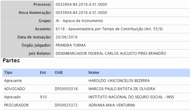 c) Agravo de Instrumento – Aposentadoria por Tempo de Contribuição – Tribunal Regional Federal da 1ª Região – Primeira Turma – Des. Federal Carlos Augusto Pires Brandão – Processo nº 0033904-84.2016.4.01.0000 – Data 20/06/2016.