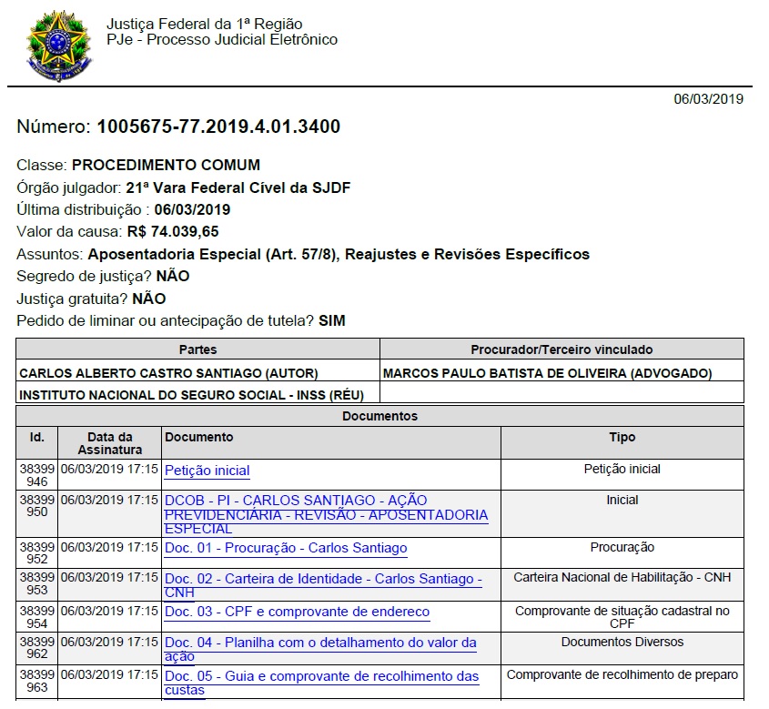 4.1 – Ação Previdenciária – Procedimento Ordinário – Revisão de Aposentadoria – Direito Previdenciário – 21ª Vara Federal da Seção Judiciária do Distrito Federal – Processo nº 1005675-77.2019.4.01.3400 – Data 06/03/2019.