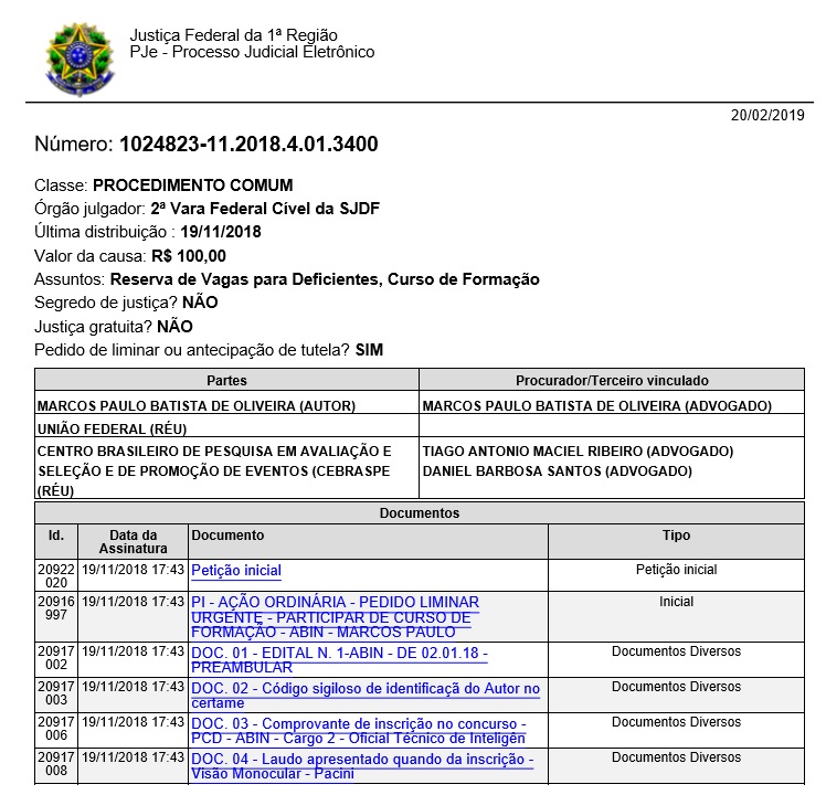 3.7 – Ação Ordinária de Obrigação de Fazer com pedido de tutela de urgência de natureza antecipada inaudita altera pars – 2ª Vara Federal Cível da Seção Judiciária do Distrito Federal – Processo nº 1024823-11.2018.4.01.3400 – Data 19/11/2018.