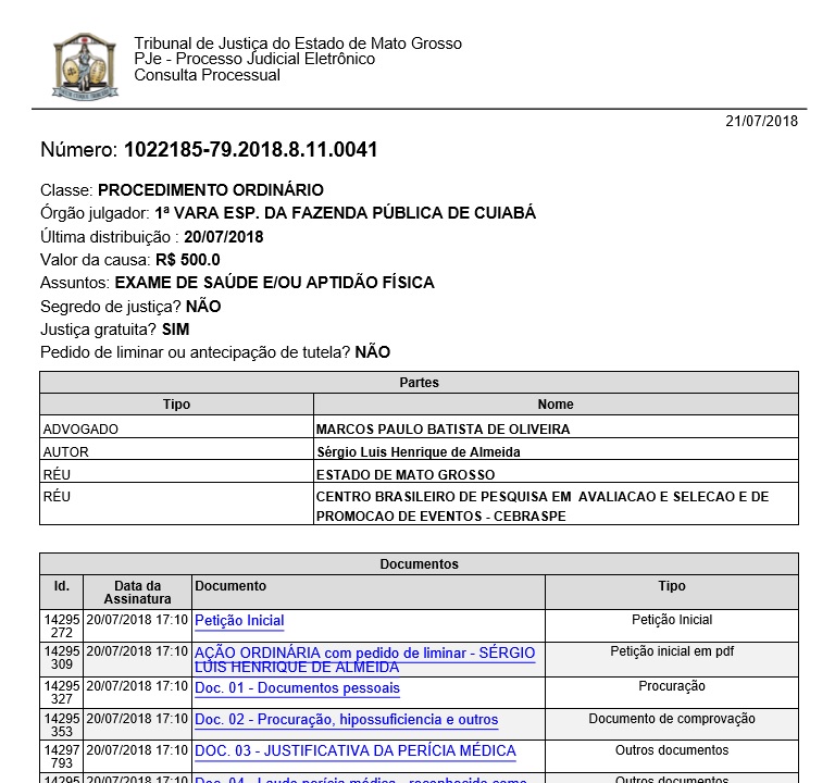 3.5 – Ação Ordinária Inominada cumulada com pedido de tutela antecipada de urgência – 1ª Vara Especializada da Fazenda Pública da Comarca de Cuiabá – TJMT – Processo nº 1022185-79.2018.8.11.0041 – Data 20/07/2018.