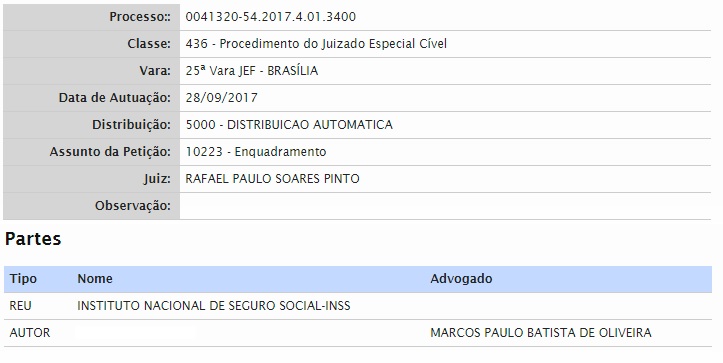 2.8 – Ação de Ressarcimento de Parcelas Vencidas – Reenquadramento Funcional – Direito Administrativo – 25ª Vara JEF – Brasília – Processo nº 0041320-54.2017.401.3400 – Data 28/09/2017.